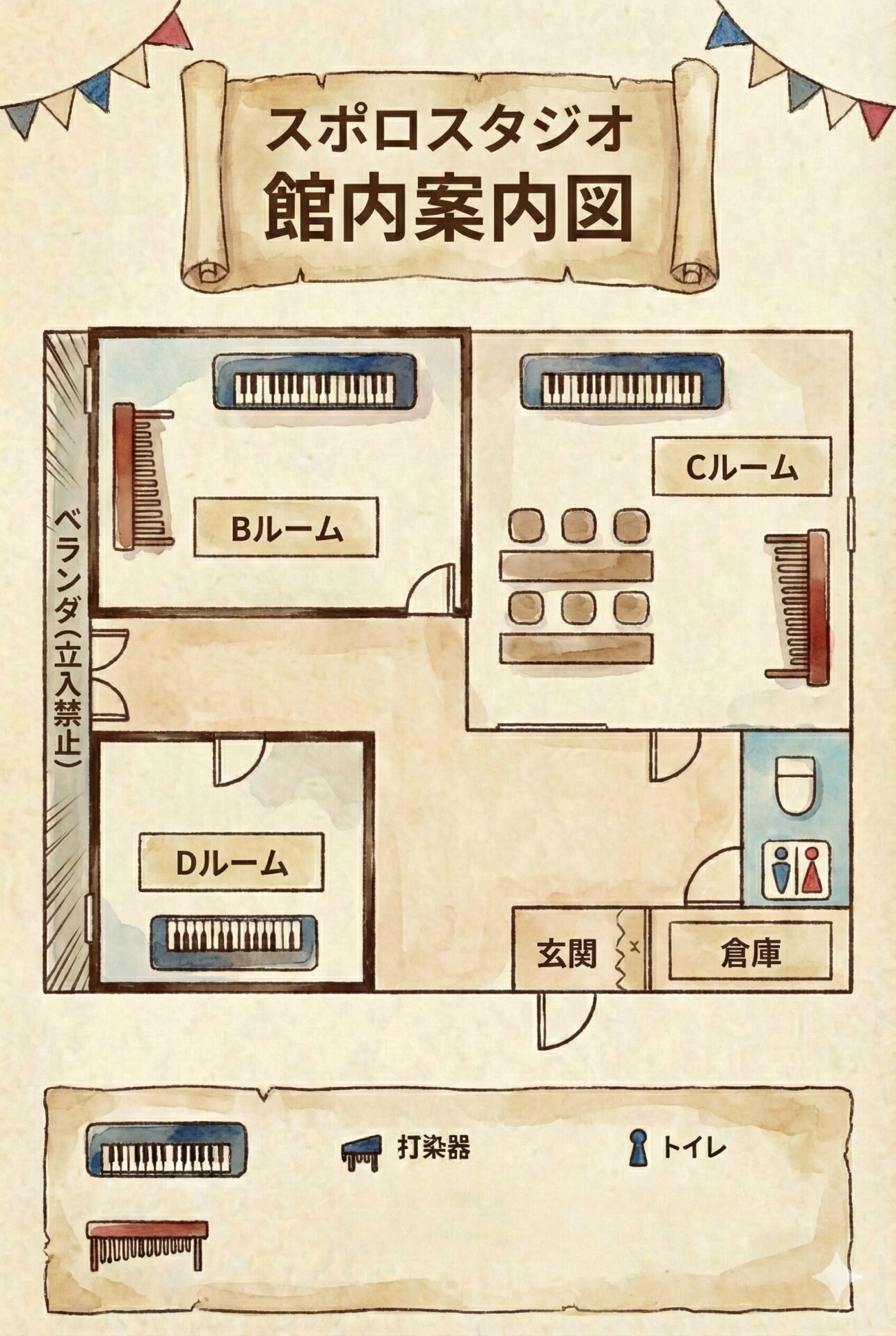 | 利用時間 | 時間料金 (基本✕時間) | 内訳 | 備品料金(楽器) | 合計 |
